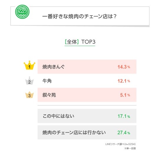 2位は「牛角」(12.1%)、3位は「叙々苑」(5.1%)という結果に。