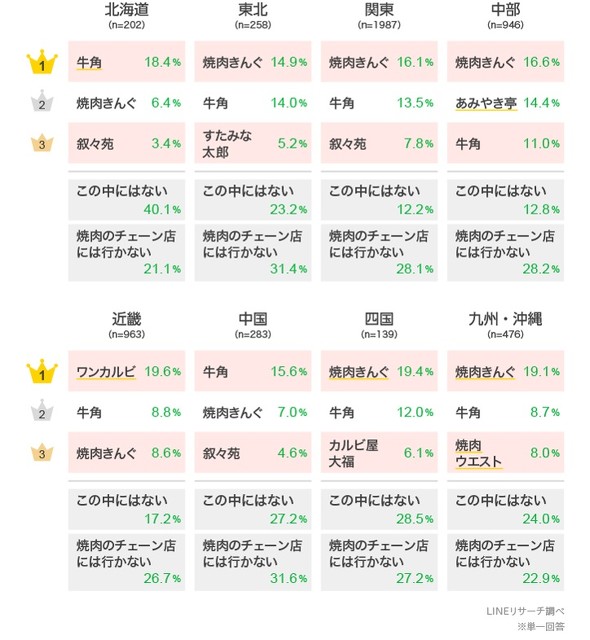 エリア別で焼肉きんぐが1位になったのは、東北、関東、中部、四国、九州・沖縄だった。牛角が1位だったのは北海道、中国だった。近畿では「ワンカルビ」が1位だった。