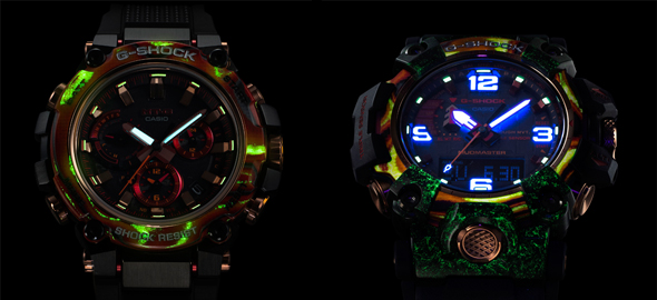 新商品「MTG-B3000FR/GWG-2040FR」は、G-SHOCKブランドを象徴する赤を強力なエネルギーで発生する太陽フレアに見立て、蓄光素材を用いたマーブル模様の積層ベゼルを採用した耐衝撃ウォッチ。カラーグラスファイバーのシートとカーボンのシートを幾層にも積み重ねてからベゼルの形に削り出す新手法で成形したという。グラスファイバーのシートに蓄光粒子を混ぜることで、暗闇でも力強く存在感を放つようにした。