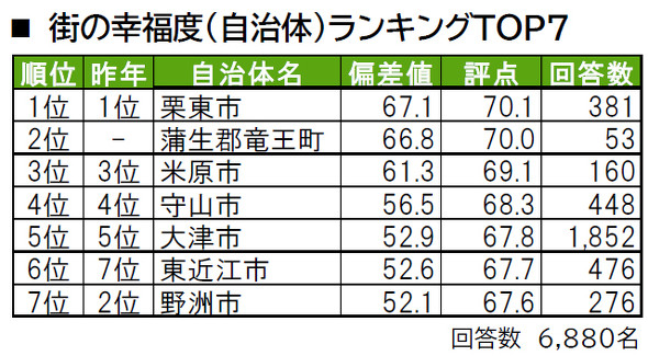 2位は近江米や近江牛など、農畜業が盛んな町「竜王町」、3位には滋賀県内で唯一新幹線が停車する米原駅を有する「米原市」がランクインした。