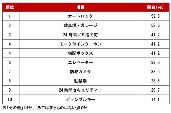 続く2位は「駐車場・ガレージ」(52.6%)、3位は「24時間ゴミ捨て可」(41.7%)という結果になった。
