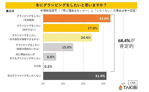 冬にグランピングをしたいと思っている人は、どのくらいいるのだろうか。グランピングに行ったことがある男女に聞いたところ、68.4%が「してみたい」と回答していることが、フォーイット(東京都渋谷区)の調査で分かった。