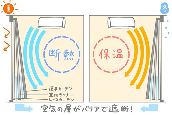 3つ目は断熱シートや断熱カーテンの利用。カーテンは床まで届くタイプにすることで、隙間から入る冷気を抑えられる。窓と部屋の間に空気の層をつくるために、カーテンを2枚使ったり、内窓を設置したりするのも効果的だ。