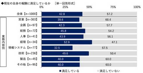 現在の自身の報酬に満足しているか尋ねると、「満足している」は42.8%、「満足していない」は57.2%という結果に。報酬に満足している人の割合は、業務内容別で「経理」(52.9%)が最も高く、次いで「技術」(49.6%)、「総務」(45.8%)と続いた。