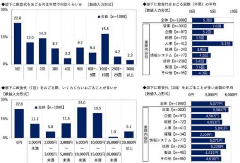 部下に飲食代をおごるのは年間で何回くらいかという質問に対しては、「0回」(22.8%)が最多となった。その他、「1回」(12.0%)や「2回」(14.3%)、「5回」(9.2%)、「10〜19回」(16.8%)などにも回答が集まり、平均は「5.3回」に。業務内容別に見ると、「人事」(9.7回)が最多で、次いで「営業」(7.6回)、「企画」(5.2回)が続いた。