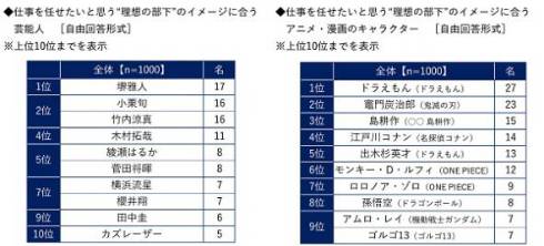 理想の上司と部下のイメージに合う芸能人とアニメ・漫画のキャラクターについて聞いた。その結果、理想の上司のイメージに合う芸能人では、「所ジョージ」(51人)が1位となり、2位「阿部寛」(35人)、3位「明石家さんま」(33人)となった。
