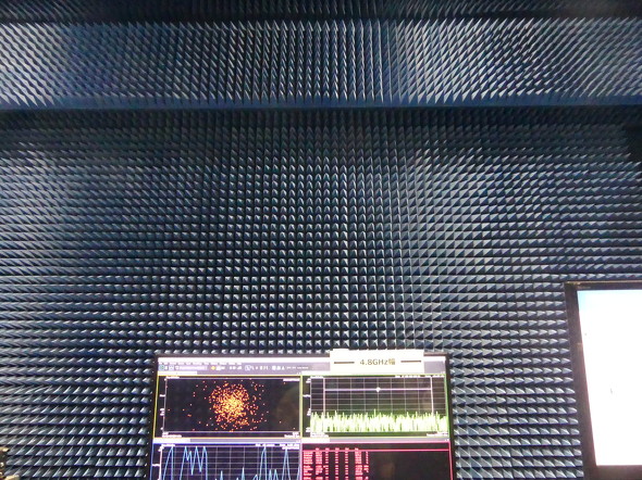 ふじみ野市にある研究所施設には、地下に電波無響室も備えている。外から電波が入らず、部屋で発生させた電波も外に出ない。室内の壁は電波が響かないようになっており、普段はアンテナの試験などを行っている。