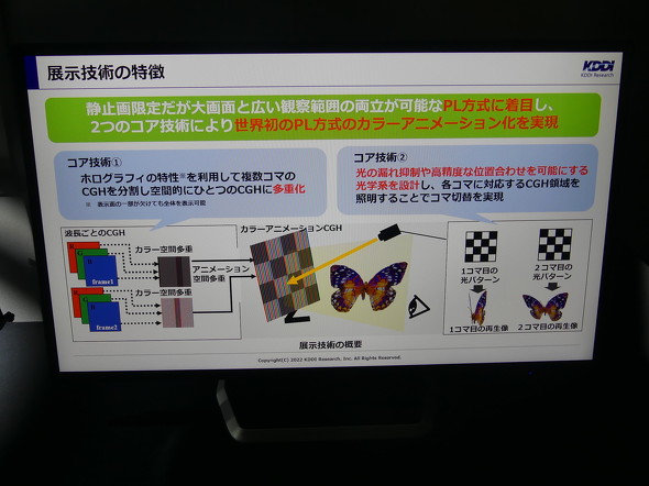 5月には関西大学と共同で、この技術を使って2コマのカラーアニメーション化にも成功した。イベントでは、静止画とアニメーションで蝶のホログラフィーが展示されていた。