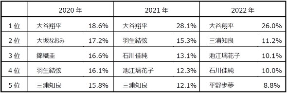 マクロミルと三菱UFJリサーチ&コンサルティングは、共同企画として「2022年スポーツマーケティング基礎調査」を実施した。好きなスポーツ選手1位となったのは5年連続で大谷翔平選手だった。2位は三浦知良選手、3位池江璃花子選手と続く。