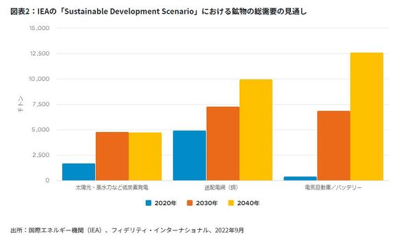 電気自動車だけではありません。世界が電気、再生エネルギーへとシフトする中、ニッケルやリチウム、コバルトなど鉱物への需要は今後30年間で急激に増えると見込まれます(図表2)。鉄鋼のような、すでに多く利用されている金属の生産量も増加すると想定されます。