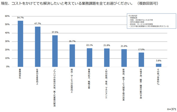 また、実際の業務においても効率化の必要性を感じている人は多い。総務などのバックオフィス業務に携わる人に、コロナ禍以降、リモートワークなどによって支障が出ている業務について尋ねると、「他社/社外関係者とのコミュニケーション」(46%)、「紙ベースの契約業務」(37%)、「紙ベースの決済(稟議)業務」(35%)が多く挙がった※2。さらに別の調査では、コストをかけてでも解決したい業務課題として最も多く挙がったのが「業務効率化」(55%)だった。「社員の生産性向上」(48%)、「ノウハウや技術の共有、属人化業務の解消」(38%)も課題と考える人が多かった※3。