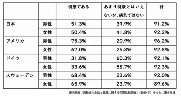 「健康である」「あまり健康とはいえないが、病気ではない」を合わせると、日本は男性が91.2%、女性が92.2%となっています。米国、ドイツ、スウェーデンもあまり差がなく、各国とも高齢の人たちの約9割が、病気ではない健康な状態であることが分かります。
