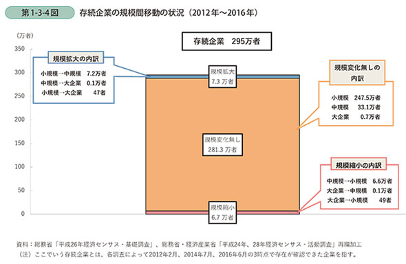 19年の『中小企業白書』の中に「存続企業の規模間移動の状況(2012年〜2016年)」という興味深いデータがある。これは16年時点で廃業せずに存続している事業者295万社が、4年前の12年からどれほど、従業員を増やすなどして企業規模を拡大させてきたのかを調べたものだ。なんと、驚くなかれ、規模拡大に成功したのはなんと7.3万社、規模縮小は6.7万社で、95%を占める281.3万社は「規模変化なし」だったのだ。
