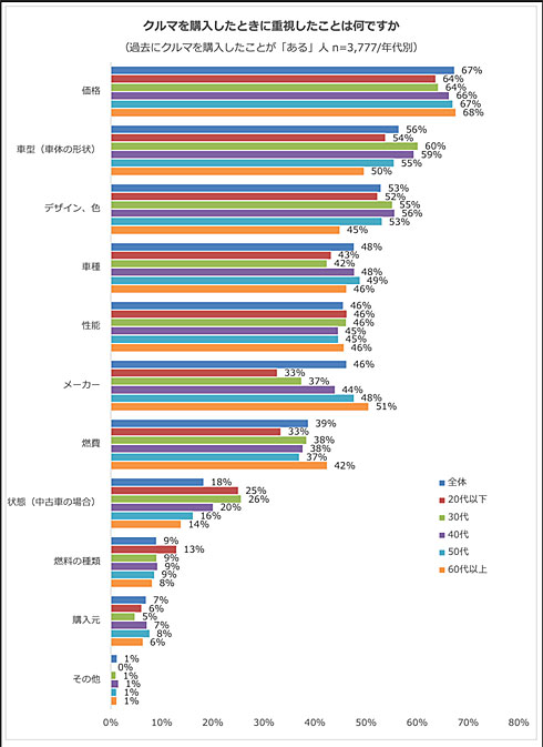 男女別でトップ3を見てみると、男性は「価格」(65%)が最も多く、次いで「車型」(56%)、「デザイン・色」(49%)だったのに対し、女性も「価格」(70%)を挙げる人がトップ。以下「デザイン・色」(58%)、「車型」(55%)という結果に。