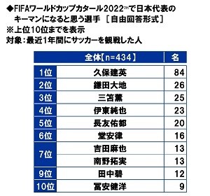 カタール大会で日本代表のキーマンになると思う選手を聞いたところ、現在所属しているスペインのレアル・ソシエダでも高い評価を得ている「久保建英」(84人)が首位。2位「鎌田大地」(26人)、3位「三笘薫」(25人)、4位「伊東純也」(23人)、5位「長友佑都」(20人)と続いた。