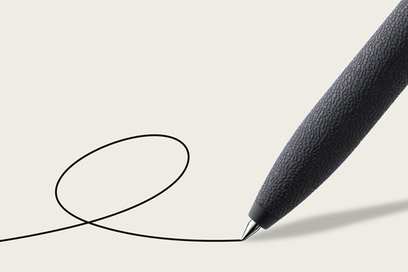 最初はより軟質のエラストマー素材に革シボ加工を施したが、グリップ力が強すぎ、ペンをうまく動かせなかった。革シボ加工はそのままに、ゴムの硬度をいくつか変えて試作したところ、十分な質感が得られる上に適度なグリップ力が得られることが分かり変更した。