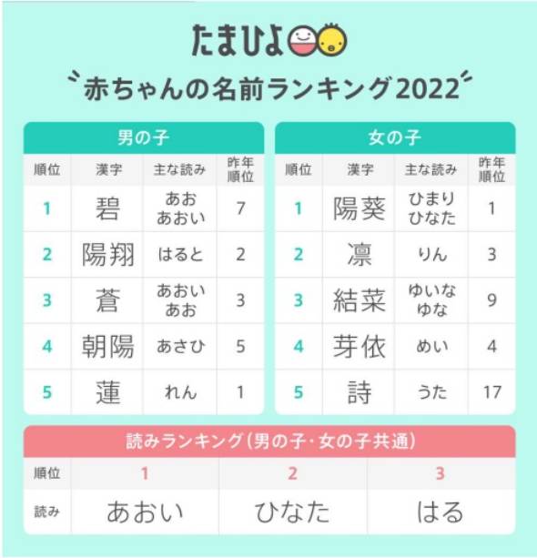 ベネッセコーポレーションは、2022年1月1日〜9月27日に生まれた新生児を対象とした「たまひよ 赤ちゃんの名前ランキング」を発表した。男の子は「碧」(主な読み「あお・あおい」)が初の1位、女の子は「陽葵」(主な読み「ひまり・ひなた」)が7年連続1位となった。