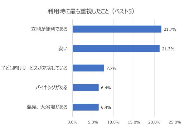 「よく利用するホテル」を使う際に最も重視したことを尋ねた。1位は「立地が便利である」(21.7%)、2位は「安い」(21.3%)、3位は「子ども向けサービスが充実している」(7.7%)、4位は「バイキングがある」と「温泉、大浴場がある」(共に6.4%)だった。