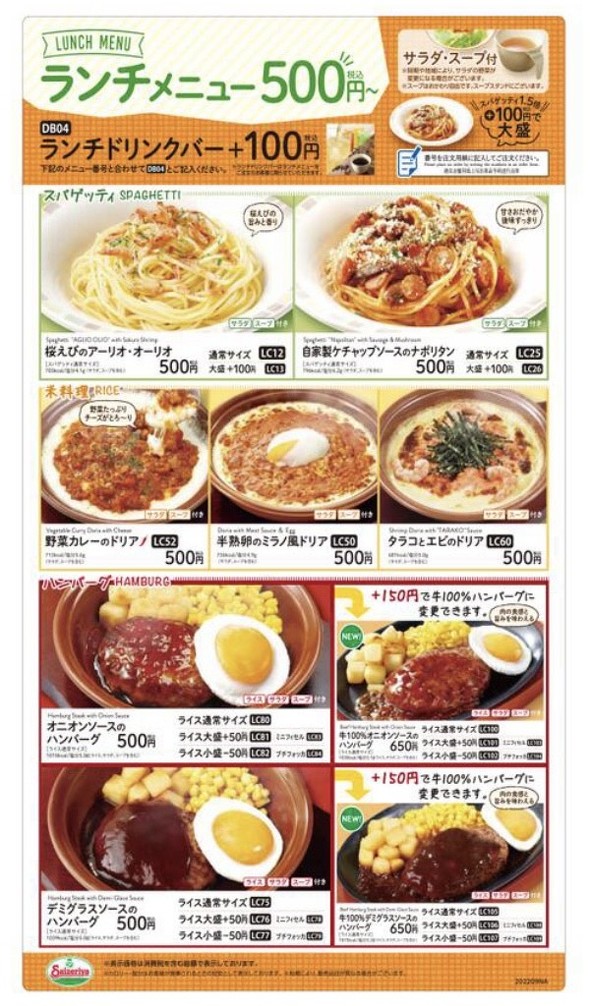 平日500円とワンコインの安価なランチは、9種類と豊富で、100円でドリンクバーも付く。