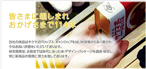 トップ画面から「サクマ式ドロップス」の画像が大きく掲載され、「皆さまに愛されて114年」とある。社名の横にも「サクマ式ドロップス」の画像があり、主力商品として大きく打ち出していることが分かる。かつて社運をかけてチャレンジをした分野は「ヘルシーライフ」というカテゴリーになっているが、それほど大きな扱いではない。