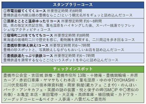「テクテク豊橋ブラ散歩」は、このスタンプラリー機能を使う。豊橋市内に26カ所のチェックポイントが設置され、「市電沿線てくてくコース」「豊橋珍景!映え映え!コース」など5コースのスタンプラリーが設定された。1コースをクリアするごとに鉄道模型や鉄道グッズなどが当たるキャンペーンに応募できる。