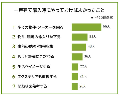 一戸建て購入時にやっておけばよかったことは? この質問に対して、「多くの物件・メーカーを回る」(99人)がトップ。次いで「物件・現地の念入りな下見」(53人)、「事前の勉強・情報収集」(48人)、「もっと設備にこだわる」(36人)、「生活をイメージする」(22人)、「エクステリアも重視する」(21人)、「間取りを熟考する」(20人)という結果に。
