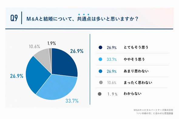 M&Aキャピタルパートナーズ(東京都千代田区)は、11月22日の「夫婦の日」に向けて実態調査を行った。事業/M&Aの経験のある既婚者の経営者に「M&Aと結婚の共通項は多いか」を聞いたところ、「とてもそう思う」(26.9%)と「ややそう思う」(33.7%)を合わせた60.6%が「そう思う」と回答した。