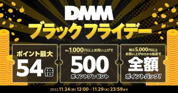DMM.comは11月24日、「DMM ブラックフライデー」を開催した。キャンペーン期間は11月29日まで。購買額に応じポイント還元率を最大で54倍にする他、さまざまなポイント還元プランを用意した。年末商戦を迎え、会員数の増加と売り上げの拡大を目指す。