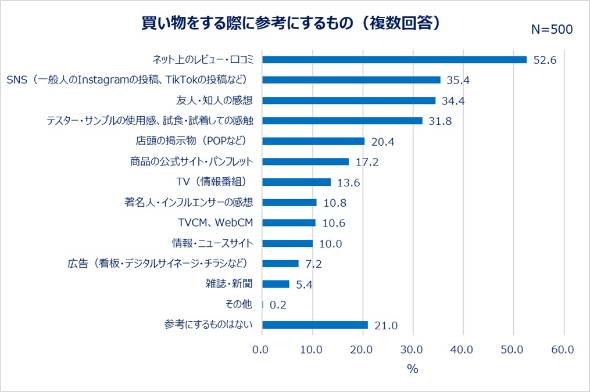 買い物をする際に参考にするものを聞いたところ、1位は「ネット上のレビュー・口コミ」(52.6%)、2位は「SNS」(35.4%)と、インターネット上の情報が上位に入った。