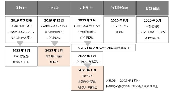 レジ袋は持ち帰り・売店用は1組5円、宅配時は無料としている。カトラリーは持ち帰り・宅配とも1本10円。また、約2700店舗の持ち帰り・宅配用のカトラリー(フォーク)については、耐久性の向上を目的に木製から竹製に順次変更する。ナイフとスプーンは、引き続き木製を使用する。