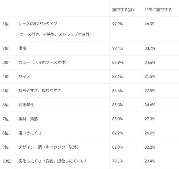 2位は1位と僅差で「価格」(92.4%)、3位は「カラー(スマホケース本体)」(88.9%)だった。「非常に重視する」のポイントに着目すると、「重視する」計で6位の「耐衝撃性」が「カラー(スマホケース本体)」と同率で2位となっており、スマホ本体の価格が高額化傾向にある中、ケースの耐衝撃性を非常に重視している人が多いことが分かった。