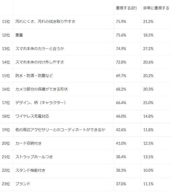 11位は「汚れにくさ、汚れの拭き取りやすさ」(75.9%)、以下「重量」(75.6%)、「スマホ本体のカラーと合うか」(74.9%)と続いている。
