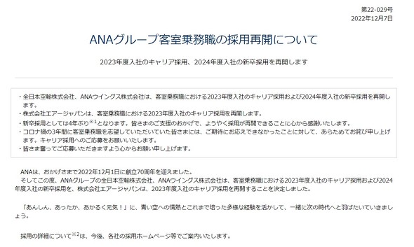 全日本空輸(ANA)は12月7日、客室乗務職(CA)の新卒採用ならびにキャリア採用を再開すると発表した。キャリア採用を2023年度入社、新卒採用は24年度入社から再開する。同社によると、新卒採用は4年ぶりとなる。