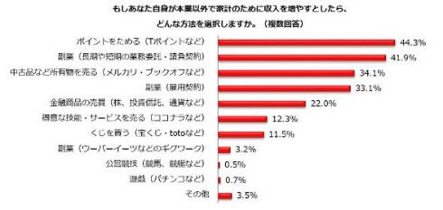 もし本業以外で家計のために収入を増やすとしたら、どんな方法を選択するかという問いには「ポイントをためる」(44.3%)という意見が最も多かった。次いで「副業(長期や短期の業務委託、請負契約)」(41.9%)、「中古品など所有物を売る(メルカリなど)」(34.1%)と続いた。