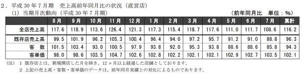 同社は人件費の高騰などを受けて、当時28年ぶりとなる値上げに踏み切り、全品280円(税別)均一の価格帯を298円(同前)まで引き上げた。値上げ以降、既存直営店において11月を除く全ての月で客数が前年割れ。売上高も、忘年会シーズンの11〜12月を除く全ての月で前年割れとなり、18年7月期の純利益を下方修正することを余儀なくされた。その後も復調を果たせず、翌19年7月期は上場以来初めての最終赤字へと転落している。