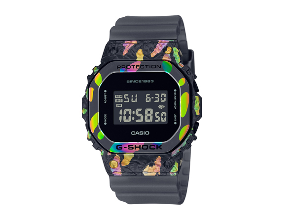 ベゼルカラーがレインボー×ブラックの「GM-5640GEM」は、初号機の角型フォルムを受け継ぐ「GM-5600」をベースモデルに、“勝利をもたらす”といわれるサンストーンをモチーフに採用した。価格は4万1800円。サイズは49.6(幅)×43.2(奥行き)×12.9(高さ)ミリ、重さ約78グラム。