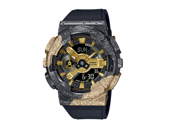 ベゼルカラーがゴールド×ホワイトの「GM-S2140GEM」は、「GM-S2100」をベースに、黄金色のカルサイトをモチーフに採用した。価格は3万3000円。サイズは46.2(幅)×40.5(奥行き)×11.3(高さ)ミリ、重さ約58グラム。
