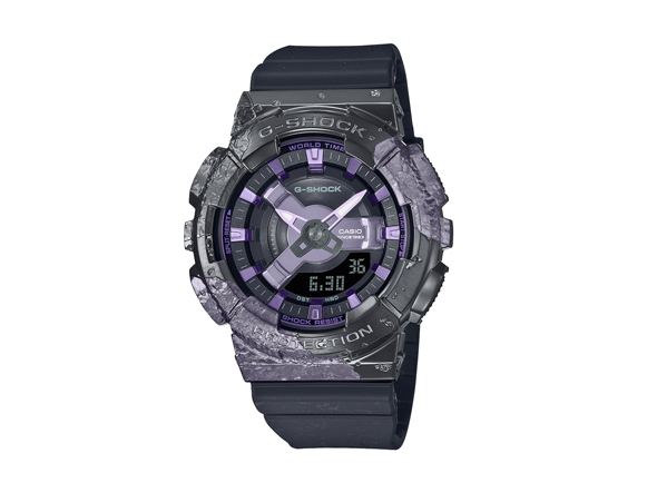 ベゼルカラーがパープル×ブラックの「GM-S114GEM」は、「GM-S110」をベースに、紫色のカルサイトをモチーフに採用した。価格は3万6300円。サイズは46.0(幅)×42.0(奥行き)×13.1(高さ)ミリ、重さ約58グラム。