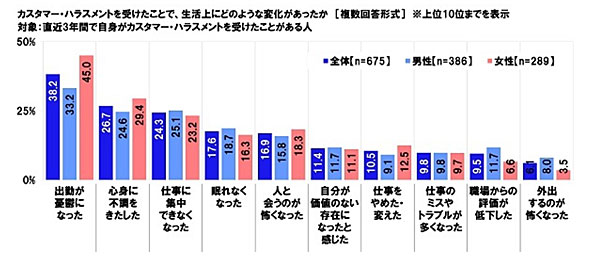 カスハラを受けたことで、生活上にどのような変化があったか尋ねたところ、「出勤が憂鬱(ゆううつ)になった」(38.2%)がトップ。以下「心身に不調をきたした」(26.7%)、「仕事に集中できなくなった」(24.3%)、「眠れなくなった」(17.6%)、「人と会うのが怖くなった」(16.9%)だった。