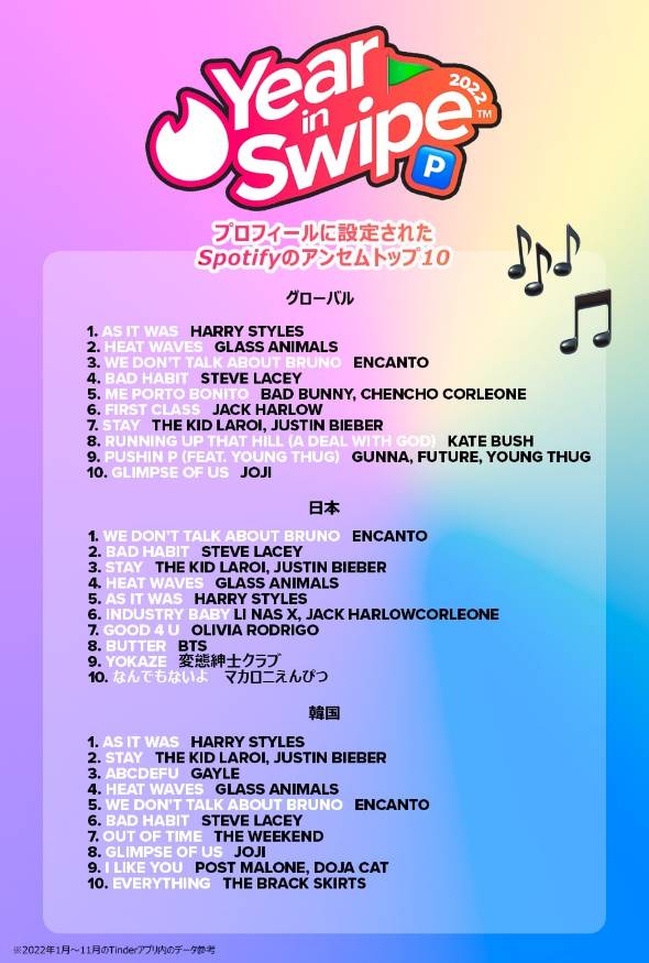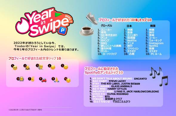 調査は2022年1〜10月に集計したTinderのメンバーの自己紹介に基づいて集計した。