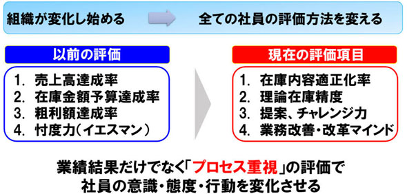 「昔は実績主義といって、売上達成率や粗利達成率、在庫金額、そして“忖度力”、この4つが評価の対象だったんです。それが今はプロセス重視に変わっています。要は、どんな課題に取り組んでいるのか、きちんと仮説・検証を立てて、改革マインドを持って業務に向き合っているか、そういうプロセスを重視することで意識改革や行動変容を促しているのです」(林さん)