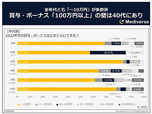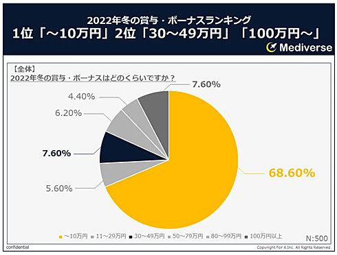 2022年冬のボーナス、どのくらいもらった人が多いのだろうか。20〜60代の男女に聞いたところ、「〜10万円」と答えた人が68.6%と圧倒的に多いことが、フォーイット(東京都渋谷区)の調査で分かった。
