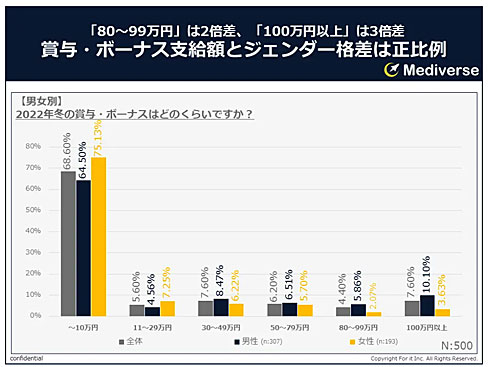 支給額を男女別に見ると、男性に比べて女性のほうが少ない傾向に。ボーナス額が「80万〜99万円」では2倍差、「100万円以上」では3倍差と、「支給額が上がるにつれてジェンダー格差が顕著となっている」(同社)