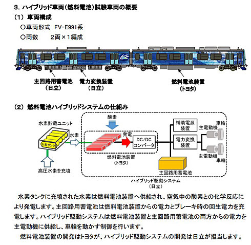 JR東日本がCO2削減の取り組みの一つとして開発した燃料電池電車。屋根上に水素タンクを搭載し、床下にある燃料電池装置に水素を送って発電する。蓄電池も搭載し、回生ブレーキで発電した電力を貯える。燃料電池と蓄電池によるハイブリッドである。
