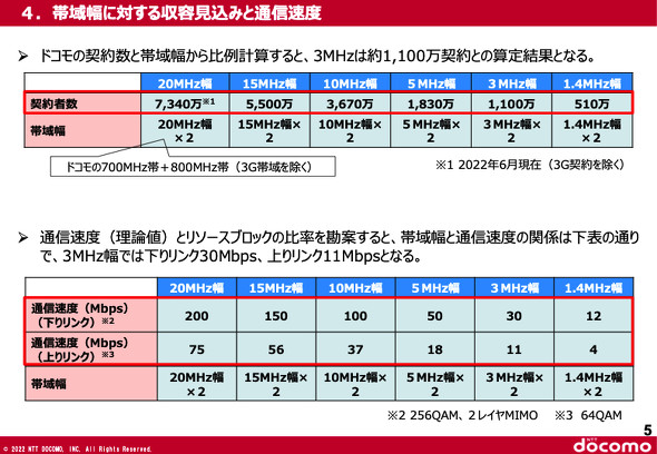 活用が提案されている700MHz帯は、715から718MHz、770から773MHzの3MHz×2幅。この周波数は、標準化団体の3GPPでバンド28として国際規格化されている。端末や基地局が標準的に対応しているバンドなので、それらの調達に差し障ることもない。また、ドコモが自社の契約数と帯域幅から比例計算すると、3MHzは約1100万契約に対応できるという。楽天モバイルの契約者数は22年9月末時点で455万契約なので、当面は3MHz幅で十分だろう。