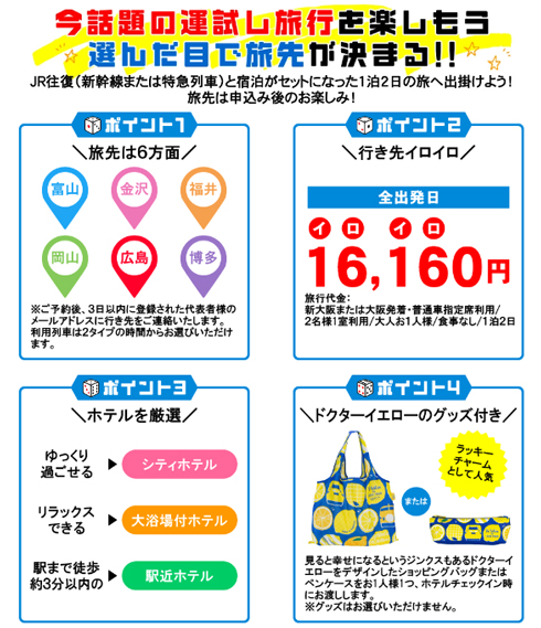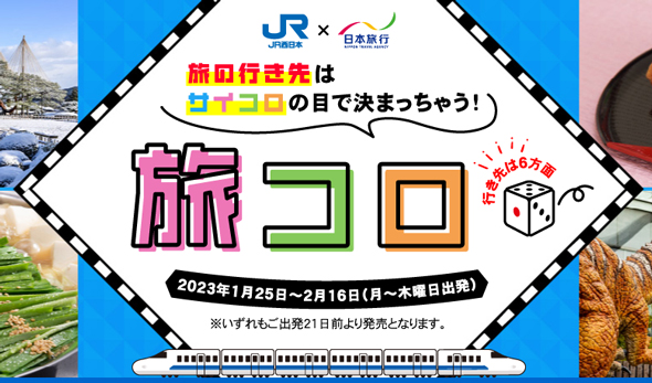 JR西日本と日本旅行は1月18日、サイコロの目で旅の行き先が決まる1泊2日のフリープラン商品「旅コロ」を発売した。JR西日本が発売する「サイコロきっぷ」のコンセプトを活用したもので、富山、金沢、福井、岡山、広島、博多の6方面からランダムに行き先が決定するもの。
