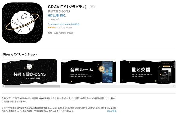 2位には「GRAVITY」がランクイン。友達と何気ない日常をシェアできるSNSとして話題となった。アバターで他ユーザーとつながれる音声ルームもあり、「気楽に人とつながれる」「有意義に友達と喋れたりするいい場所」などの意見があった。