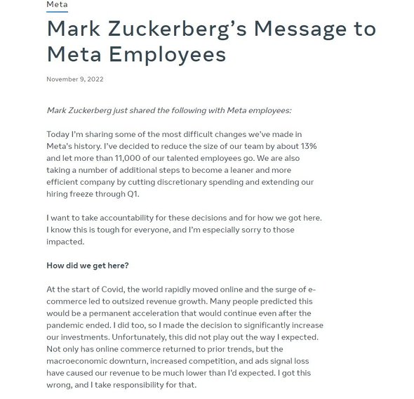 メタが1.1万人削減を発表 マーク・ザッカーバーグCEOが明かす