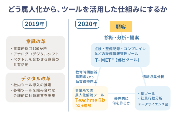 これらに対し「誰でも一定の作業が実施できるようになる」ことが最良の解決策と判断したTMESは、19年に社内の意識改革、デジタル変革に着手。同時に事業所での属人化解消ツールとして、スタディストが提供する「Teachme Biz(ティーチミー・ビズ)」の小規模導入もスタートさせた。当初メインで導入を進めたのはDX推進部で、その後データサイエンス室がBIツールを用いて社員の行動を分析、問い合わせが起こりやすい設備の特定などを行った上で「Teachme Bizで何をマニュアル化するか」の優先順位を検討。制作した各種マニュアルを活用し社員の教育時間の削減や早期戦力化、サービスの品質維持・向上に努めるなど入念な導入計画を遂行した。
