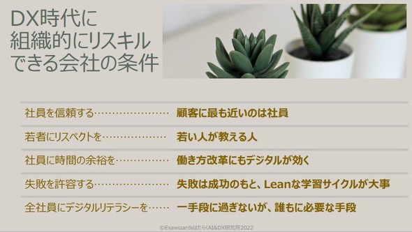 最後に、DXの時代に組織的にリスキルできる会社の条件を説明する。